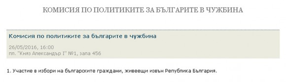 Днес се състоя заседание на Комисията по политиките за българите в чужбина (КПБЧ) към Народното събрание, на тема „Участие в избори на българските граждани, живеещи извън република България“. На заседанието присъстваха съветникът на българския външен министър Даниел Митов Иларион Иларионов, който е бивш член на ЦИК, зам.-председателят на ДАБЧ Димитър Владимиров, представители на инициативата „Искам да гласувам“ – Десислава Христова и Бела Димова, Антоанета Цонева от Института за развитие на публичната среда. В дискусията в това заседание участва и редакторът на Eurochicago.com Мариана Христова. На днешното заседание на Комисията не присъстваха нейни членове от парламентарната група на Патриотичния фронт.