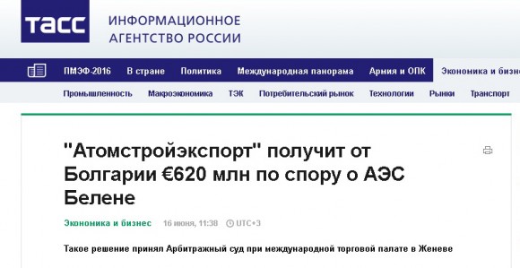 ТАСС съобщи, позовавайки се на „Росатом“, че арбитражът в Женева е осъдил България по спора за АЕЦ „Белене“.