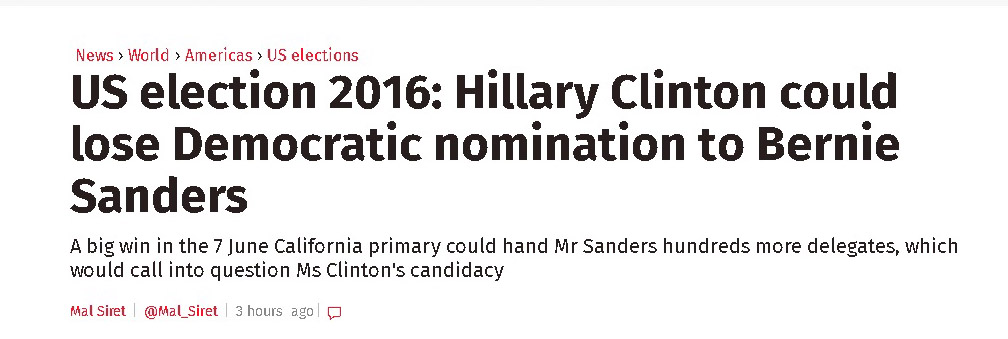 Бившият държавен секретар Хилъри Клинтън може да загуби надпреварата за номинация на демократите след предстоящите предварителни избори в Калифорния на 7 юни, пише британският в. „Индипендънт“. Нейният основен конкурент сенатор Бърни Сандърс се насочва към щата с надеждата да натрупа повече гласове на делегати, след като в Калифорния през последните месеци е регистрирано значително увеличаване на регистрирани делегати.