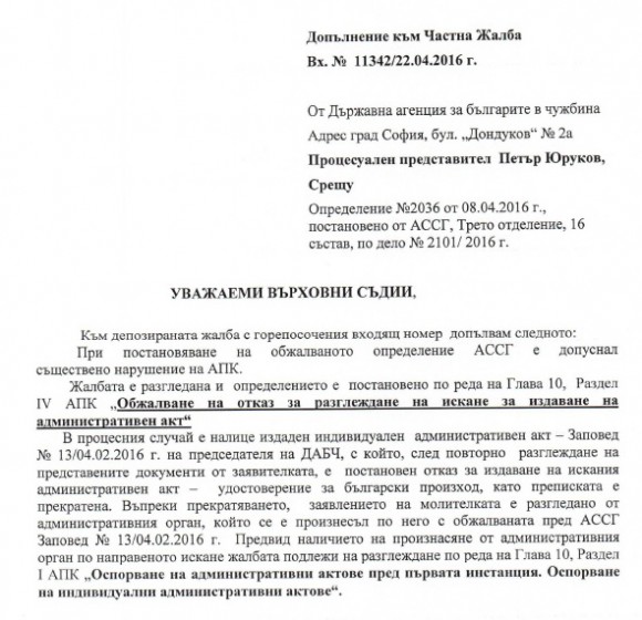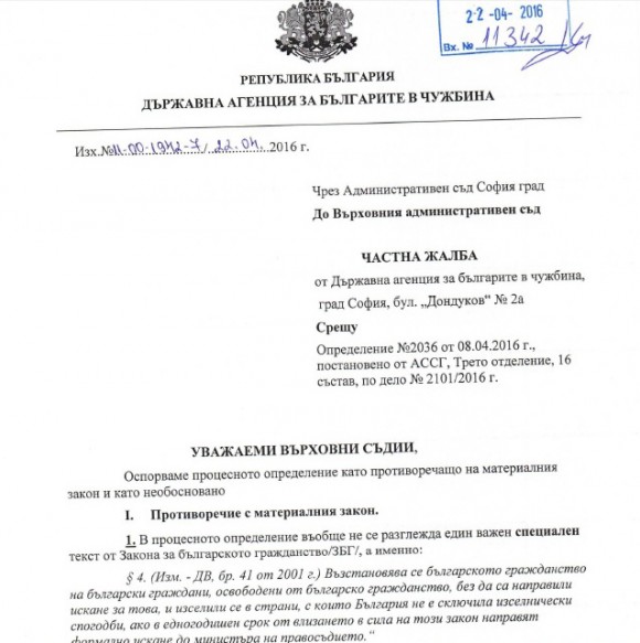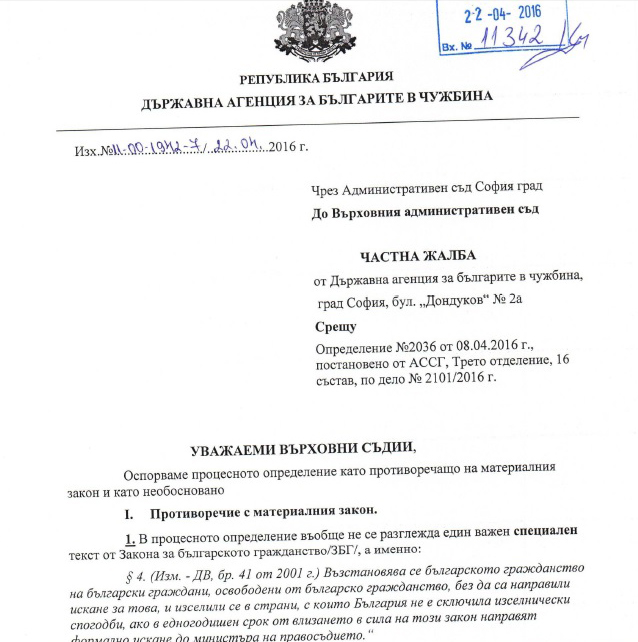 Този път жалбата до ВАС е подадена от директора на Държавната агенция за българите в чужбина (вж. тук – Частна жалба Гюнери). В нея той поставя няколко важни въпроса, на които ВАС трябва да отговори.