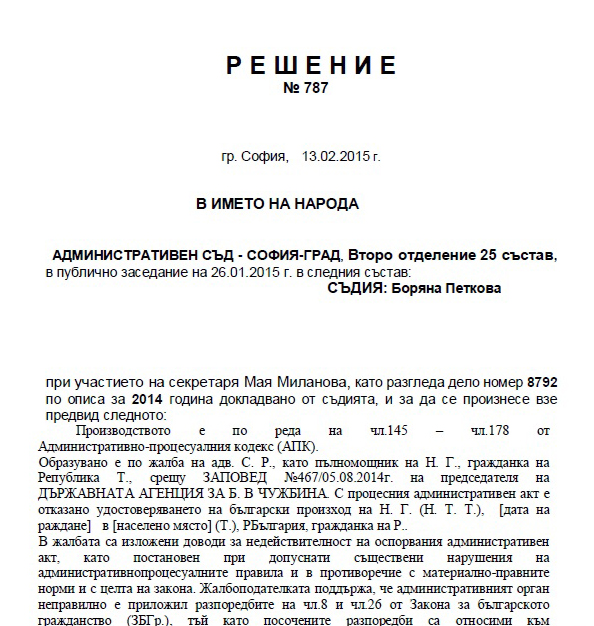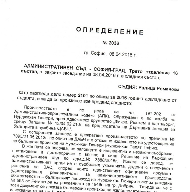 С определение от 13 февруари 2015 г. АССГ отхвърля жалбата на Нурджихан. В мотивите на съда се казва: „Според определението, дадено в §2, т.1 от Допълнителните разпоредби на ЗБГ „лице от български произход“ е лице, на което поне единият възходящ е българин. От смисловото и граматическо тълкуване на нормата следва, че за удостоверяване на български произход е необходимо да е налице директна връзка с възходящ от 1 степен, от който лицето да произхожда пряко и който към датата на подаване на заявлението да е българин – т.е. да е от българска народност, чийто майчин език е български. В процесния случай е безспорно установено с приетото по делото препис – извлечение от гражданските регистри на област Т., че към датата на смъртта си, съответно 10.10.2000 г. и 17.11.2004 г., родителите на жалбоподателката, са били турски граждани и не са българи по народност. Макар родителите на жалбоподателката да са били български граждани към момента на раждането й, впоследствие те по собствена воля и по силата на чл. 16, ал. 2 ЗБГ (обн. ДВ, бр.79/1968г., отм. ДВ, бр.136/1998г.) са изгубили българското си гражданство, както и самата жалбоподателка, която като пълнолетна е придобила турско гражданство.“ (Виж пълния текст на определението в прикачения файл – АССГ-13 февруари 2015.)