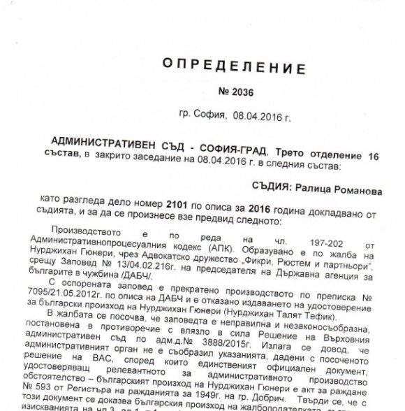 С определение от 8 април 2016 г. АССГ отменя заповедта на директора на ДАБЧ като повтаря мотивите на ВАС, цитирани по-горе. Накрая добавя, че в акта за раждане на Нурджихан е отразено, че двамата ѝ родители са български граждани. Това е официален документ и като такъв отразява обстоятелствата в него, които не са оспорени, нито е подложена под съмнение неговата автентичност. „Следователно, към момента на своето раждане жалбоподателката безспорно е била българска гражданка с родители български граждани„, се казва в определението на АССГ (пълния текст в прикачения файл – АССГ-8 април 2016).