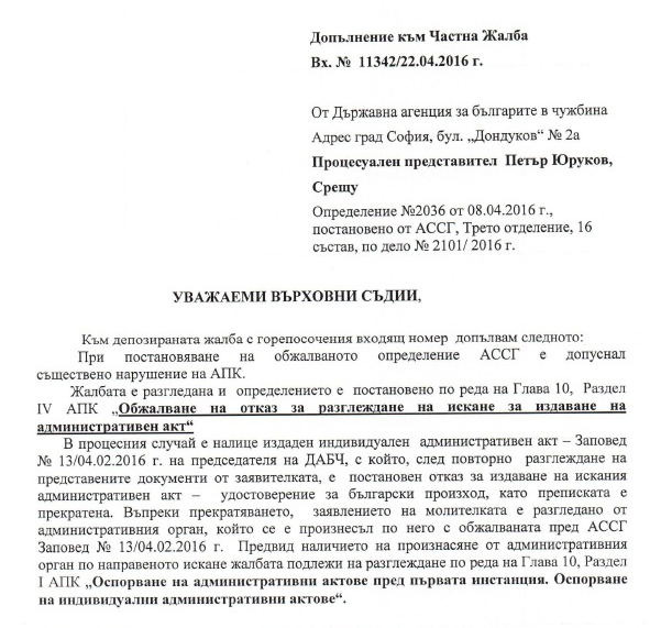 Към споменатата частна жалба от ДАБЧ до ВАС има и допълнение, което може да се види тук – Допълнение към частната жалба