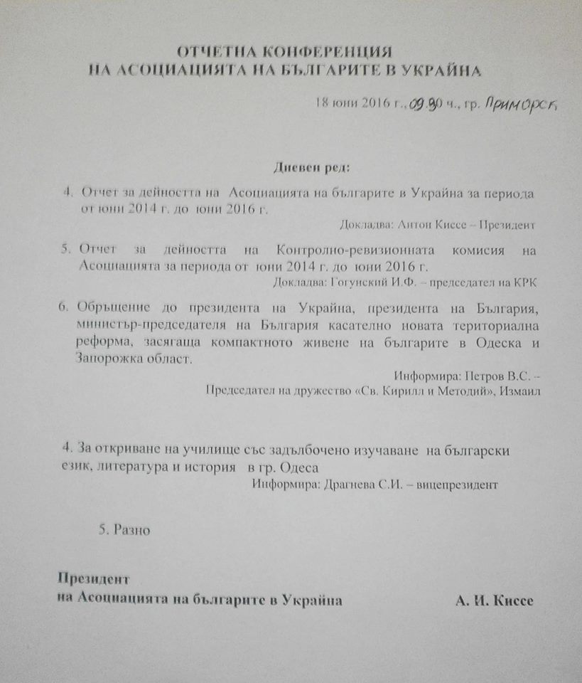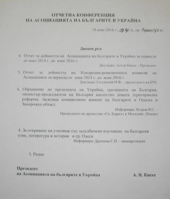 1. Отчет за дейността на Асоциацията на българите в Украйна за периода юни 2014 – юни 2016 г.; 2. Отчет за дейността на Контролната комисия на Асоциацията за същия период; 3. Обръщение до президентите на Украйна и на България Петро Порошенко и Росен Плевнелиев, и до министър-председателя на България Бойко Борисов, касателно новата териториална реформа в Украйна, засягаща компактното живеене на българите в Одеска и Запорожка области (още по темата за новата териториална реформа в Украйна и закриването на Болграски район вж. тук – бел.ред.); 4. За откриване на училище със задълбочено изучаване на български език, литература и история в гр. Одеса; 5. Разни.