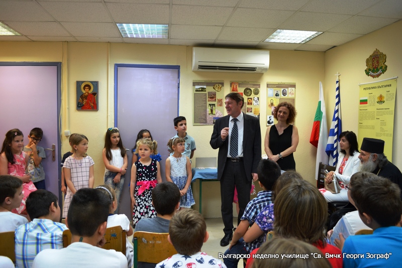 Благословия и сърдечни поздравления получихме от схиархимандрит Амвросий, игумен на Зографската света обител, който раздаде удостоверенията за завършен клас на учениците. С пожелания за много успехи, Генералният консул на Р. България в Солун Владимир Писанчев също приветства децата за успешно завършената учебна година. Директорът на БНУ „ Св. Вмчк. Георги Зограф” Димитрина Чучукова изрази благодарност към всички присъстващи за труда и усилията, които са положили през изминалата година, и им пожела весела и безгрижна ваканция.