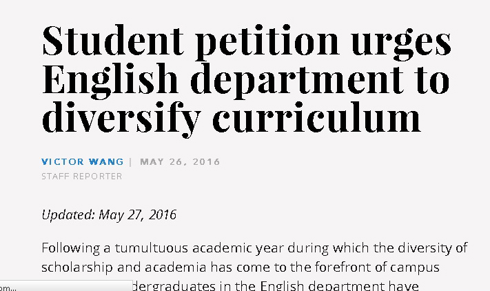 Според подкрепилите петицията студенти, които според Yale Daily News са повече от 160, курсът по класическа английска литература, в който има само бели автори мъже, насаждал култура, враждебна към цветнокожите, и неглижирал литературния принос на жените, цветнокожите и различните.