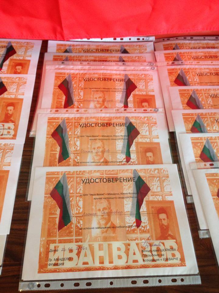 ПЪРВА ГОДИНА НА АСОЦИАЦИЯ “БУКВАРЧЕ”, ПЪРВИТЕ УДОСТОВЕРЕНИЯ ОТ БНУ “ИВАН ВАЗОВ” – гр. МАНДЕЛЮ, ЮЖНА ФРАНЦИЯ, ЗА УСПЕШНО ЗАВЪРШЕНА ГОДИНА, ПЪРВИ ПРАЗНИК НА ТАЛАНТИТЕ НА УЧИЛИЩЕТО