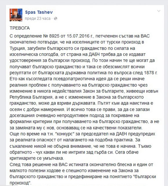С определение № 8925 от 15.07.2016 г. (съдържанието на това определение може да се види по-долу – бел.ред.), петчленен състав на ВАС окончателно потвърди, че на изселниците от турски произход в Турция, загубили българското си гражданство по силата на изселническа спогодба, от страна на ДАБЧ трябва да се издават удостоверения за български произход. По този начин те ще могат да получават българско гражданство и така се обезсмислят всички резултати от българската държавна политика по въпроса след 1878 г.