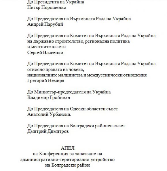 Участниците в конференцията излязоха с апел към президента на Украйна Петро Порошенко, председателя на Върховната Рада Андрей Парубий, председателя на Комитета на Върховната Рада за държавно строителство, регионална политика и местни властни на Върховната Рада Сергей Власенко, председателя на Комитета на Върновната Рада за правата на човека, националните малцинства и междуетническите отношения Грегорий Немиря, министър-председателя на Украйна Владимир Гройсман, председателя на Одеския областен съвет Анатолий Урбански и председателя на Болградския районен съвет Дмитрий Димитров.