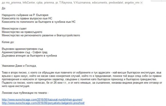 Това е второ писмо, с което се обръщам към повечето от изброените и тук адресати – най-висши български институции, във връзка с един казус, който не касае само конкретния случай, който го е предизвикал, понеже той води след себе си правни противоречия и неясноти от принципен характер, свързани с понятия като български произход и българско гражданство. Първото си писмо, което написах, бе от 26 юни т.г., и от него нямаше, за съжаление, никаква видима реакция или отговор от нито една институция.