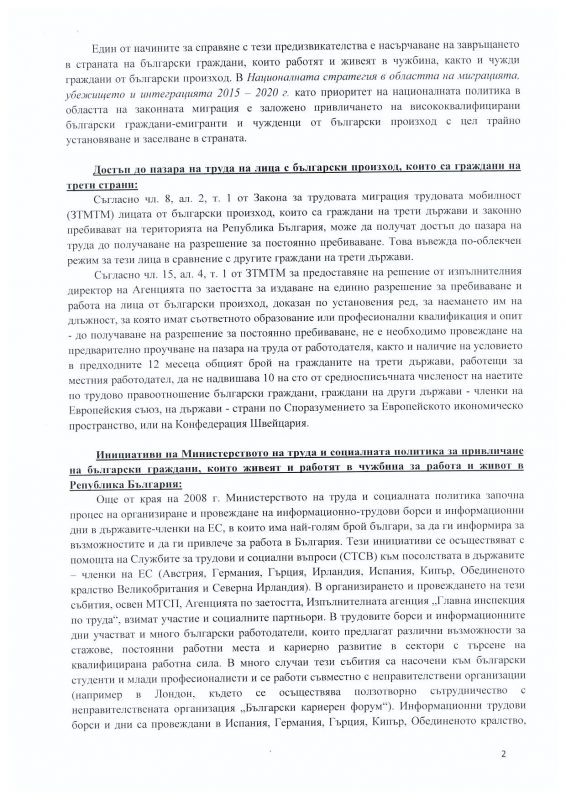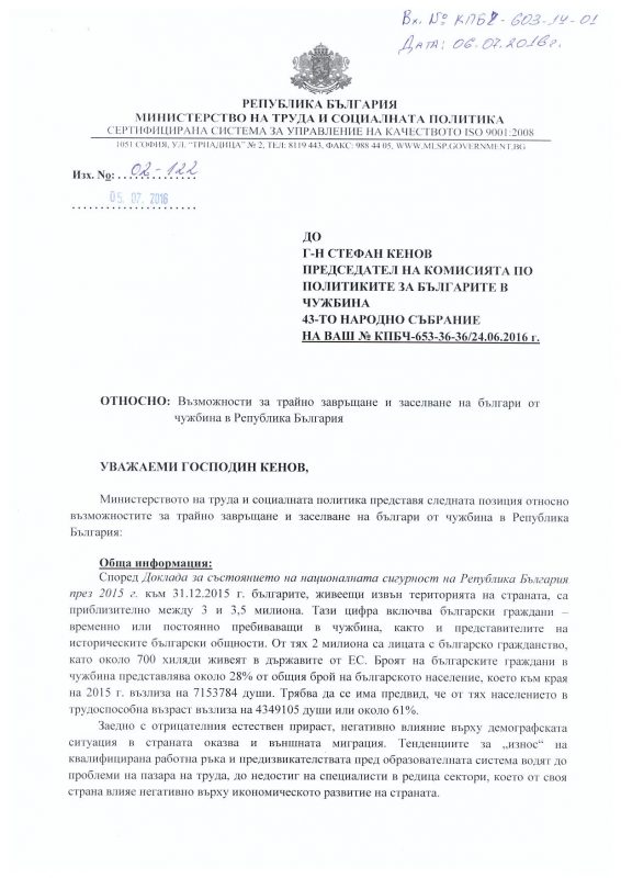 Становище на Министерството на труда и социалната политика, изпратено на Комисията по поликите за българите в чужбина, във връзка със заседание на комисията, посветено на възможностите за трайно завръщане и заселване на българи от чужбина в Р. България (вж. тук). Становището е подписано от социалния министър Зорница Русинова и е качено в сайта на на НС.