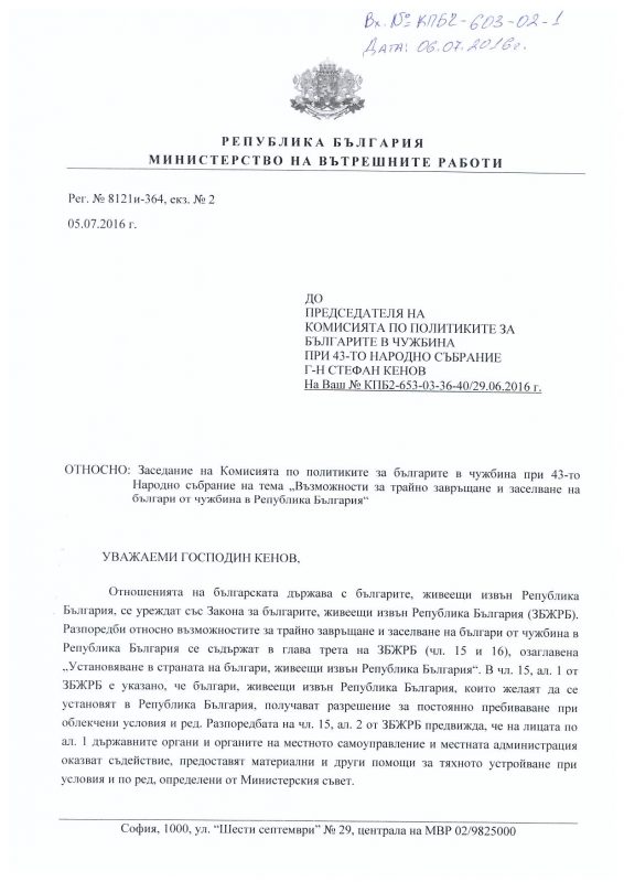 Становище от Министерство на вътрешните работи, свързано с възможности за трайно завръщане и заселване на българи от чужбина в Р. България, изпратено на 6 юли 2016 г. на Комисията по политиките за българите в чужбина към Народното събрание. На същата дата тази парламентарна комисия проведе заседание, посветено на същата тема (вж. тук). Становището е подписано от вицепремиера и министър на вътрешните работи Румяна Бъчварова и е качено в сайта на НС.