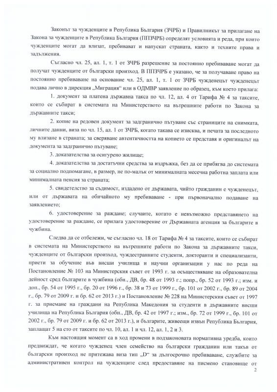 В него между другото се казва: „Към настоящия момент са в ход промени в подзаконовата нормативната уредба, които предвиждат, че когато чужденец, член на семейство на български гражданин, или такъв от български произход не притежава виза пит „D“ за дългосрочно пребиваване, службите за административен контрол на чужденците, след предоставяне на писмено становище от Държавна агенция „Национална сигурност“ и след съгласуване с Дирекция „Консулски отношения“ на Министерство на вътрешните работи, могат да продължат срока на пребиваване или да изрешат разрешение за пребиваване, когато държавният интерес налага това или при извънредни обстоятелства“.