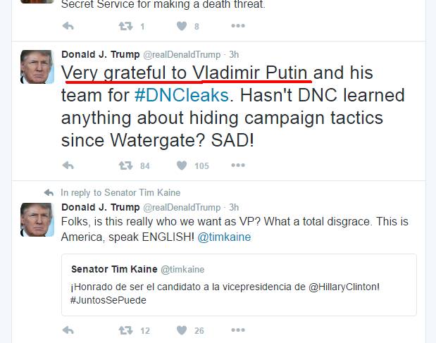 Very grateful to Vladimir Putin and his team for #DNCleaks. Hasn’t DNC learned anything about hiding campaign tactics since Watergate? SAD!