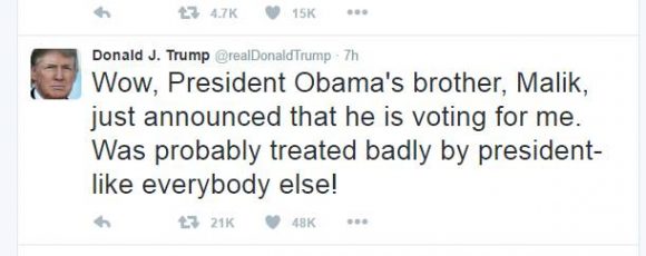 В превод: Уау, братът на президента Обама, Малик, току-що обяви, че той ще гласува за мен. Вероятно е бил третиран зле от президента, както и всички останали!