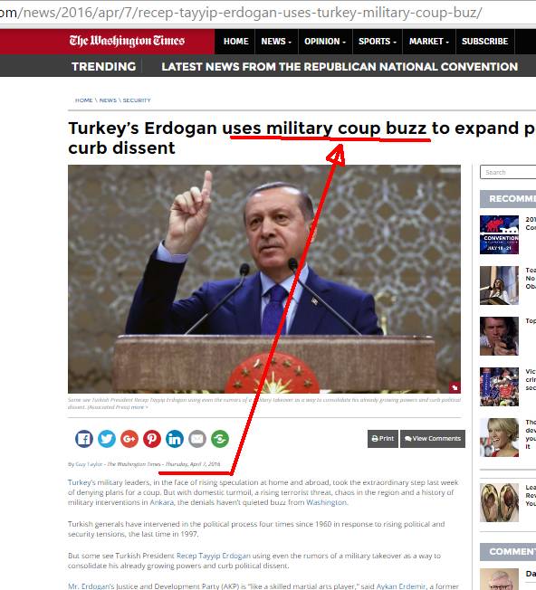 Дори заглавието говори само по себе си: „Премиерът на Турция Ердоган използва слухове за преврат за разширяване на правомощията си, за ограничаване на несъгласните“. Но ето още два цитата от началото на статията:
