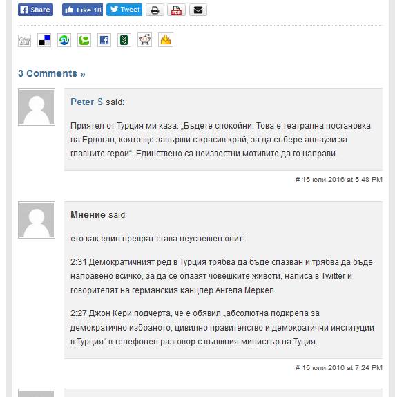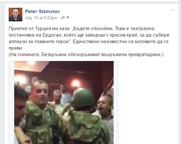 Подобни и други разнопосочни изказвания ме накараха отново да се обърна към моя турски приятел и да го попитам – как той, млад човек без висше образование, живеещ далеч от Турция и работещ по строежите като дърводелец от сутрин до вечер 6 дни в седмицата, е успял толкова бързо да се ориентира. Отговори ми простичко: „Повечко чета и сам си правя изводите.“ И ми препоръча да потърся в Гугъл думите „преврат в Турция“, като изключа последната седмица.
