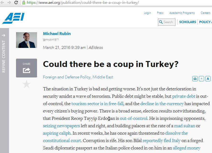 Следващото факсимиле е от статия от Марк Рубин от American Enterprise Institute, ексшеф в Департамента на отбраната на САЩ в Пентагона. Тя е от още по-рано – от 21 март 2016 г. Заглавието е: „Може ли да има преврат в Турция?“ и е препубликувана и в „Нюзуик“ и в други издания.