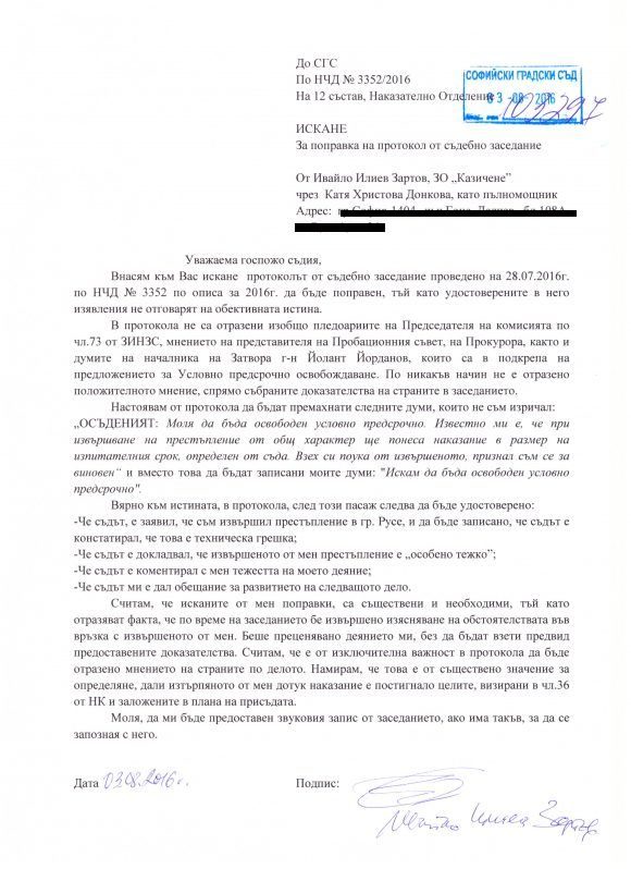 Във връзка с протокола от заседанието за УПО, проведено на 28.07.2016 г., Ивайло Зартов е изпратил на 3.08.2016 г., чрез свой пълномощник, искане до СГС, 12 наказателно отделение, което се ръководи от същата съдийка Даниела Талева, искане за поправка на съответния протокол. В искането се казва: