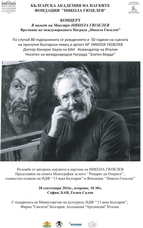 През настоящата 2016 г. – на 17 август се навършиха 80 години от рождението на големия български оперен артист Маестро Никола Гюзелев. В тази връзка Фондация „Никола Гюзелев“ заедно с други организации предвижда значими културни събития, посветени на 80-годишнината от рождението и 50 години сценична дейност на прочутия български певец и артист. Никола Гюзелев е Доктор Хонорис Кауза на БАН, Комендатор на Италия, Носител на престижната международна награда „Златен Верди“, удостоен е с най-високи отличия на България и на Италия.