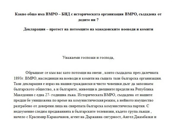 Обръщаме се към Вас като потомци на онези, които създадоха през далечната 1893 г. ВМРО, наследници на воеводи и комити на същата тази българска организация. Тази декларация е израз на нашия граждански и чисто човешки дълг да запознаем българското общество, а и българите, живеещи в днешните предели на Република Македония, с една 27-годишна лъжа.