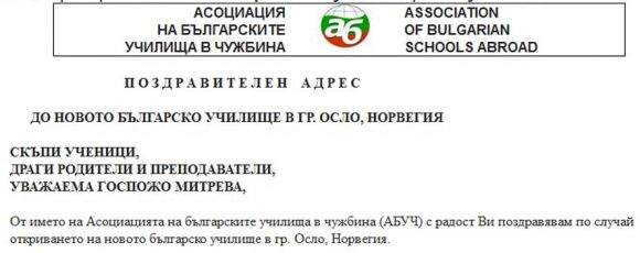 От името на Асоциацията на българските училища в чужбина (АБУЧ) с радост Ви поздравявам по случай откриването на новото българско училище в гр. Осло, Норвегия.