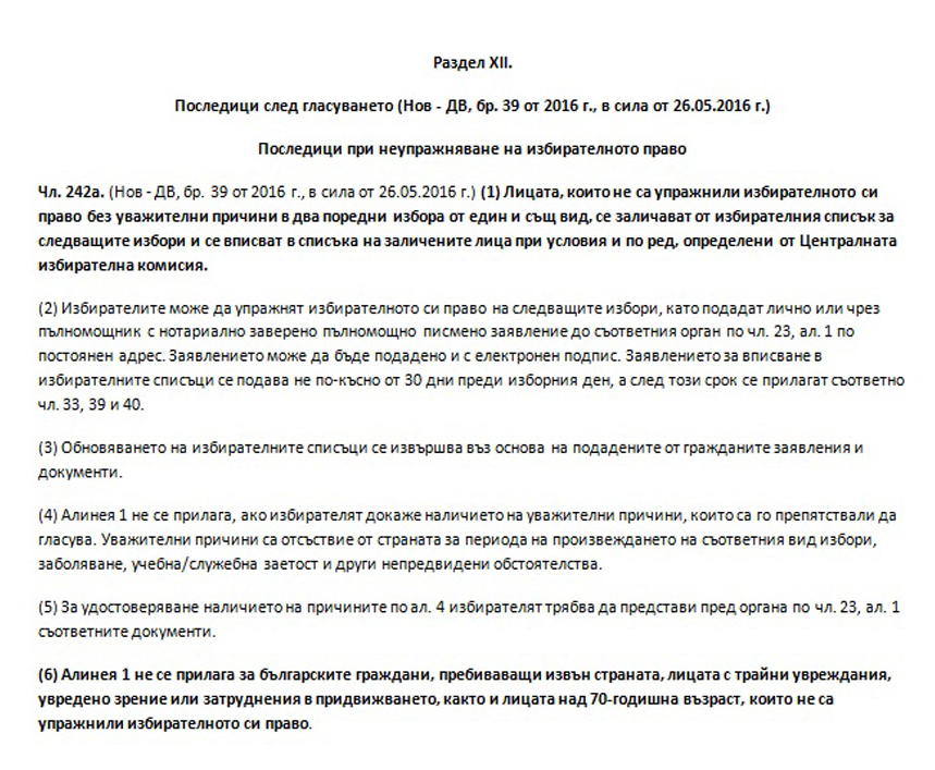„Съгласно чл. 242а, ал. 1 от Изборния кодекс (изм., ДВ, бр. 39 от 2016 г., в сила от 26.05.2016 г.) лицата, които не са упражнили избирателното си право без уважителни причини в два поредни избора от един и същи вид, се заличават от избирателния списък за следващите избори и се вписват в списъка на заличените лица при условия и по ред, определени от ЦИК. Алинея 6 на същия член предвижда, че ал. 1 не се прилага за българските граждани, пребиваващи извън страната, лицата с трайни увреждания, увредено зрение или затруднения в придвижването, както и лицата над 70-годишна възраст, които не са упражнили избирателното си право.“