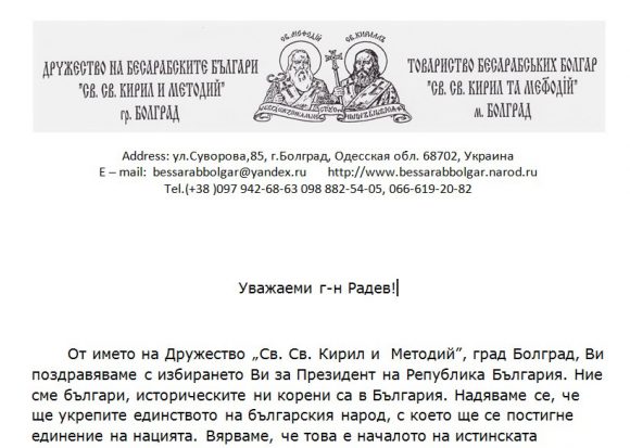 От името на Дружество „Св. Св. Кирил и Методий”, град Болград, Ви поздравяваме с избирането Ви за Президент на Република България. Ние сме българи, историческите ни корени са в България. Надяваме се, че ще укрепите единството на българския народ, с което ще се постигне единение на нацията. Вярваме, че това е началото на истинската промяна за Р. България. Нека бъдем единни в този бързо променящ се свят! Очакваме българската държава и народ твърдо да заявят своята подкрепа в полза на своите сънародници в Украйна.