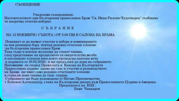 Както бе оповестено още миналия месец, и както и нашето издание съобщи (вж. тук), на 12 ноември т.г. трябва да се проведе първото от години насам Общо събрание на членовете на църквата „Св. Иван Рилски Чудотворец“ в Чикаго. След всички скандали, конфликти, съдебни дела, противоречия и пр., които се случиха около този български храм в Чикаго, е много важно това събрание да се проведе в спокойна и различна отпреди обстановка. Ще бъде ли така обаче?