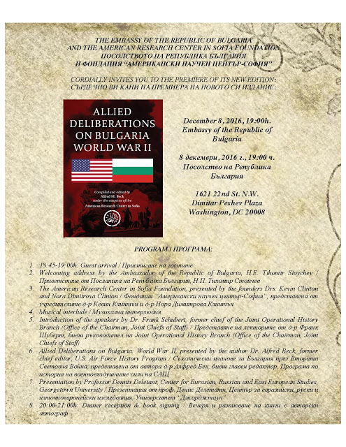 Сборникът с американски архиви за Втората световна война „Съюзническите планове за България – Втората световна война“ ще бъде представен във Вашингтон.