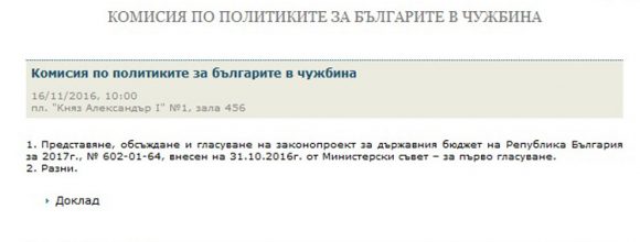 На свое заседание, проведено на 16.11.2016 г., Комисията по политиките за българите в чужбина обсъди Законопроект за държавния бюджет на Република България за 2017 г. в частта му за политиките към българите в чужбина.