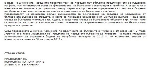Във връзка със споменатия фонд е било отправяно преди питане до Министерски съвет и министъра на финансите, каза пред наш представител председателят на Комисията Стефан Кенов. Но отговор не е бил получен. Затова между първо и второ четене на Държавния бюджет в пленарна зала, депутати от КПБЧ ще предложат определяне на средства в бюджета на Министерски съвет за подпомагане на български огранизации в чужбина. Дали обаче това предложение ще бъде прието и в Държавния бюджет на Р. България за 2017 г. ще бъде запожено и гласувано създаването на фонд за подпомагане на български организации зад граница, колкото и скромен да е този фонд, не е нито ясно, нито сигурно.