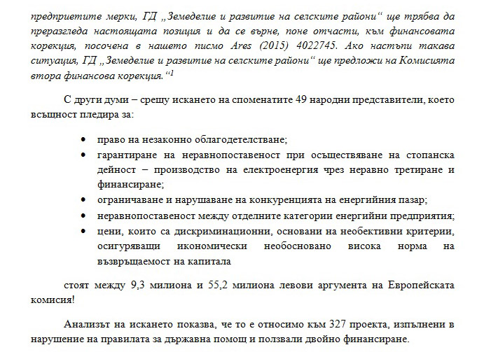По същество, зад цялата инициатива стои всъщност констатирано нарушение – конкретни субекти са ползвали двойно финансиране за една и съща инвестиция, а именно: от една страна, получаване на субсидии за финансиране на изграждането на енергийни обекти като бенефициенти по мерки 311 „Разнообразяване към неземеделски дейности“ и 312 „Подкрепа за създаване и развитие на микропредприятия“ от Програмата за развитие на селските райони за периода 2007 – 2013 г., а от друга страна – получаване на преференциална цена за изкупуване на електрическата енергия.