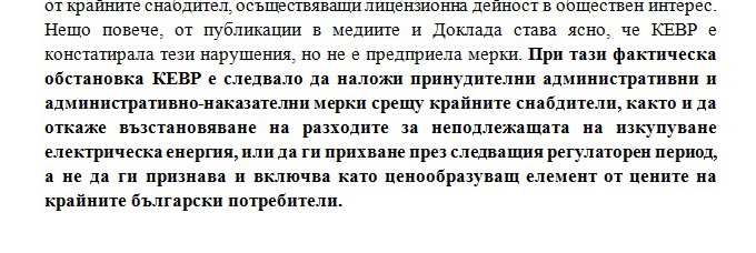 „…При тази фактическа обстановка КЕВР е следвало да наложи принудителни административни и административно-наказателни мерки срещу крайните снабдители, както и да откаже възстановяване на разходите за неподлежащата на изкупуване електрическа енергия, или да ги прихване през следващия регулаторен период, а не да ги признава и включва като ценообразуващ елемент от цените на крайните български потребители.“