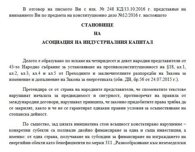 Председателят на УС на Асоциацията на индустриалния капитал в България Васил Велев е изпратил Становище до Конституционния съд, във връзка с конституционно дело №12/2016 г. Делото е образувано по искане на 49 народни представители от 43-то Народно събрание и претендира за противоконституционност на някои алинеи от Преходните и заключителните разпоредби на Закона за изменение и допълнение на Закона за енергетиката. В случая става дума всъщност за над триста проекта за вятърни и фотоволтаични централи, заради които 49-те депутати са поискали образуване на споменатото дело в КС. Тези проекти, както е констатирала и Европейската комисия, са били изпълнени в нарушение на правилата за държавна помощ и са ползвали двойно финансиране. Те са получили 111 765 хил. лева субсидия, срещу която инвеститорите са вложили собствени пари само 38 009 хил. лева.