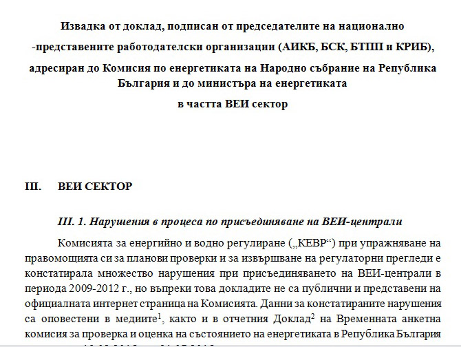 Извадка от доклад, подписан от председателите на национално представените работодателски организации (АИКБ, БСК, БТПП и КРИБ), адресиран до Комисия по енергетиката на Народно събрание на Република България и до министъра на енергетиката – в частта ВЕИ сектор.