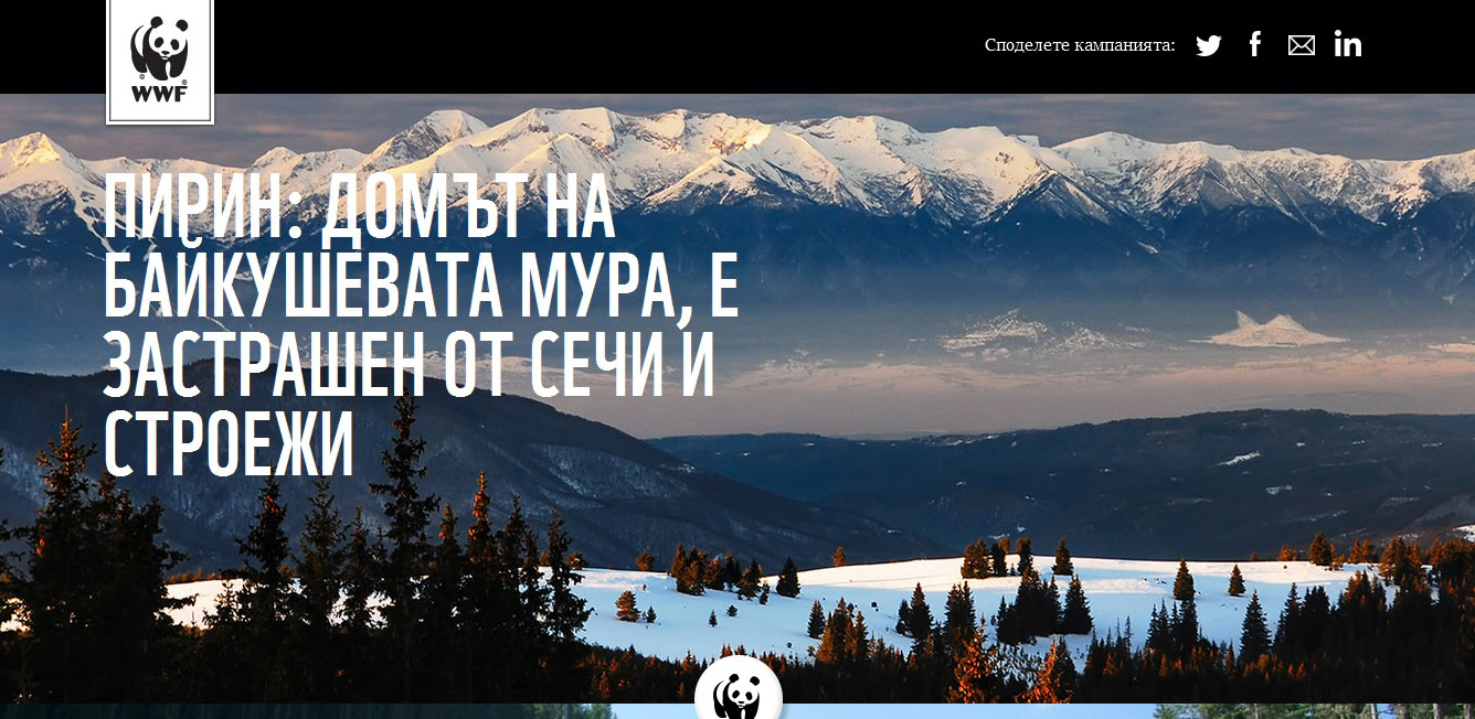 Българският офис на международната природозащитна организация WWF (World Wide Fund for Nature, преди World Wildlife Fund) започна кампания за спасяването на Пирин, който е сериозно застрашен от стопански сечи и нови строежи. Организаторите на кампанията са направили онлайн подписка, адресирана към министър-председателя на България, в която се казва следното: