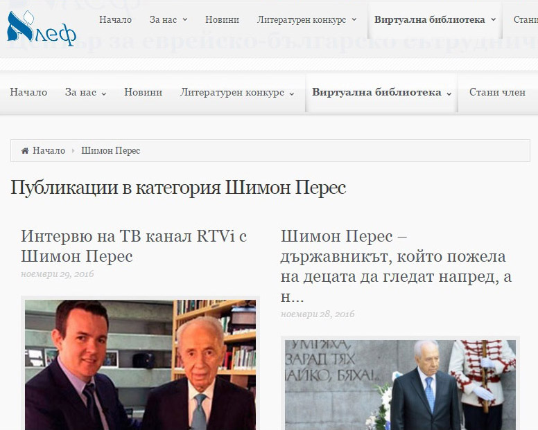 Центърът за еврейско-българско сътрудничество „Алеф” създаде най-голямата виртуална библиографска сбирка за големия израелски държавник, политик и миротворец Шимон Перес. Във време, когато светът преоткрива човешките ценности, за да се противопостави на агресията, животът, стремежите и постъпките на Шимон Перес могат да бъдат пример за мъдрост и поведение, които трасират пътища между минало и бъдеще. Затова „Алеф” издири множество публикации и свидетелства за ключови и значими за новата история изяви на големия политик и ги събра на едно място.