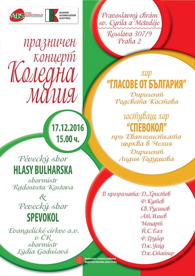 На 17 декември т.г., от 15 ч. местно време, в православния храм „Свети Кирил и Методий“ в Прага ще се състои празничен концерт, наречен „Коледна магия“. В концерта ще участват хор „Гласове от България“ с диригент Радосвета Костова и хор „Спевокол“ при Евангелистката църква в Чехия, с диригент Лидия Годушова. В програмата влизат произведения на Д. Христов, Ф. Кутев, Св. Русинов, Ат. Илиев, на Моцарт, Бах, Грубер и др. Организаторите на събитието канят сърдечно нашите сънародници в Прага, както и всички желаещи, да дойдат в църквата „Свети Кирил и Методий“, за да се насладят на красива музика и коледно настроение.