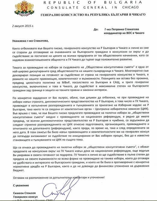 Първо следват цитати от писма на Петранка Стаматова към български емигранти от миналата година, в което тя дава разяснения, защо в Чикаго трябва да бъдат създани Обществени съвети (съктатено ОС), при все че в „столицата на емиграцията ни“ има много действащи български организации: