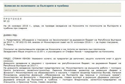 На 16 ноември 2016 г. се провежда заседание на Комисията по политиките за българите в чужбина /КПБЧ/ към Народното събрание, при дневен ред: „1. Представяне, обсъждане и гласуване на Законопроект за държавния бюджет на Република България за 2017 г., № 602-01-64, внесен от Министерския съвет на 31 октомври 2016 г. – за първо гласуване; 2. Разни“. На заседанието присъстват представители на Министерство на външните работи, Министерство на образованието, Министерство на финансите и на Държавната агенция за българите в чужбина.
