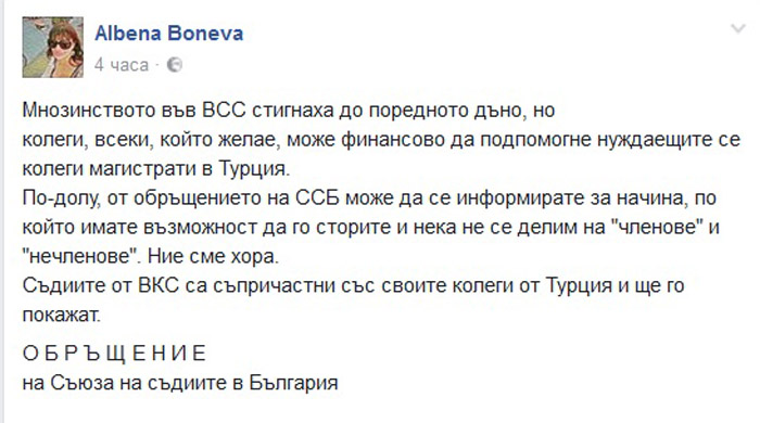 Съюзът на съдиите в България обявява откриването на дарителска сметка за събиране на средства за подкрепа на задържаните под стража и отстранени от работа турски съдии и прокурори, и на техните семейства. След опита за преврат в Турция от м. юли 2016 г. почти 3 000 съдии и прокурори първоначално бяха отстранени от работа, а след това и срещу тях започнаха наказателни производства. Много от тях бяха задържани и към настоящия момент продължават да се намират в арестите. По силата на законодателството, прието в рамките на обявеното извънредно положение, беше конфискувано и цялото имущество на заподозрените като участници в опита за преврат турски магистрати.