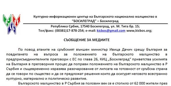 По повод атаките на сръбският външен министър Ивица Дачич срещу България за повдигането на въпроса за положението на българското малцинство в предприсъединителните преговори с ЕС по глава 26, КИЦ „Босилеград“ приветства усилията на България в преговорния процес да поправи положението на българското малцинство в Р. Сърбия и същевременно изразява разочарование от липсата на готовност от сръбска страна да се говори по същество и да се предложат решения, които да осигурят неговото всестранно културно, материално и политическо развитие.