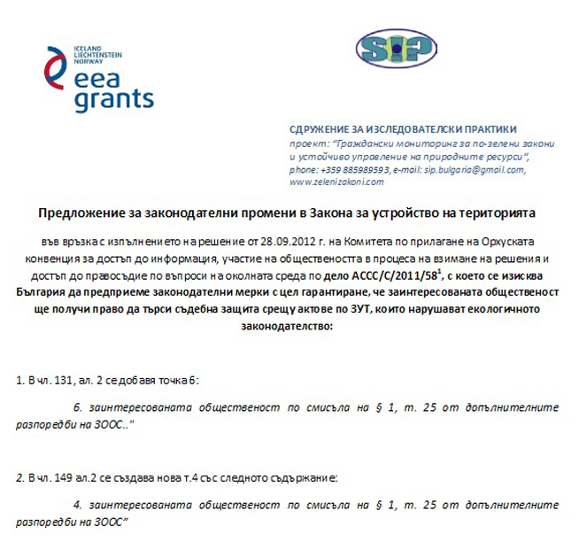 Природозащитниците припомнят, че още в края на 2015 г. са внесли предложения за изменение на Закона за устройство на територията, които, в изпълнение на Орхуската конвенция, касаят предоставяне право на гражданите да обжалват общи и подробни устройствени планове, както и разрешения за строеж, одобрени в нарушение на екологичното законодателство. С внесените предложения природозащитниците настояват народните представители да включат в ЗУТ разпоредбите за достъп до правосъдие, съгласно изискванията на конвенцията, което смятат за по-приоритетно и в по-голям обществен интерес от предвидения за обсъждане в последните дни лобистки и крайно спорен Закон за концесиите.