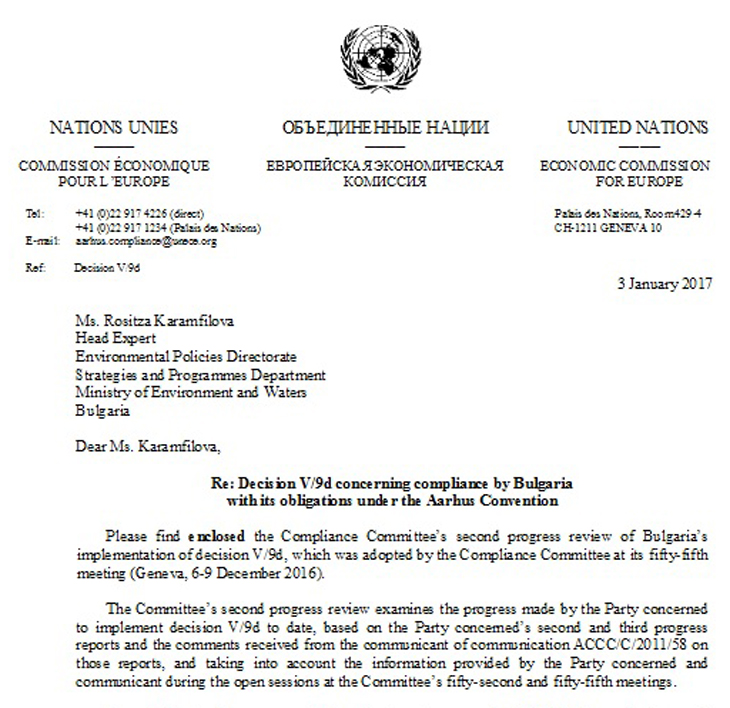 – Писмо от 03.01.2017 г. на Комитета за прилагане на Орхуската конвенция до България