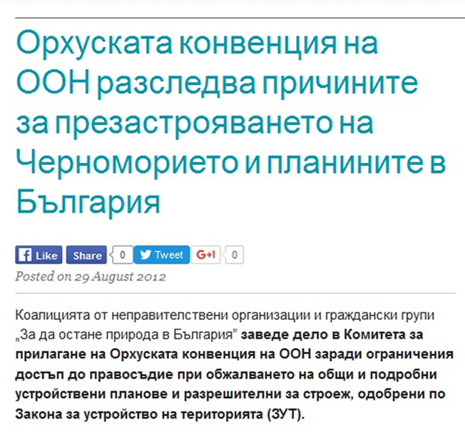 Заради драстичните нарушения в българското строителство Орхуската конвенция взе изключително категорично решение през 2014 г., което има европейска значимост. Именно то ще даде възможност на гражданите да защитават интересите си от недобросъвестни строителни предприемачи и корумпирани общински чиновници.