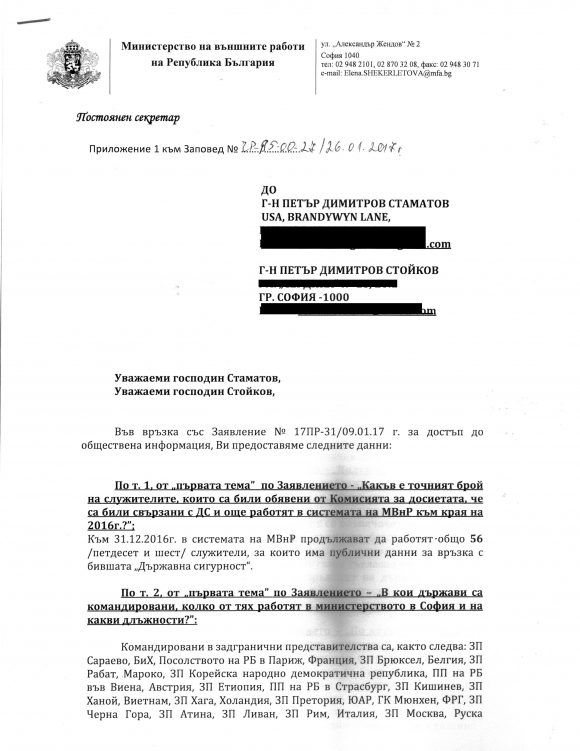 Отговорът е подписан от Елена Шекерлетова, постоянен секретар на МВнР. В него се казва, че към 31.12.2016 г. в системата на Министерството на външните работи продължават да работят 56 служители, за които има публични данни за връзка с бившата Държавна сигурност.