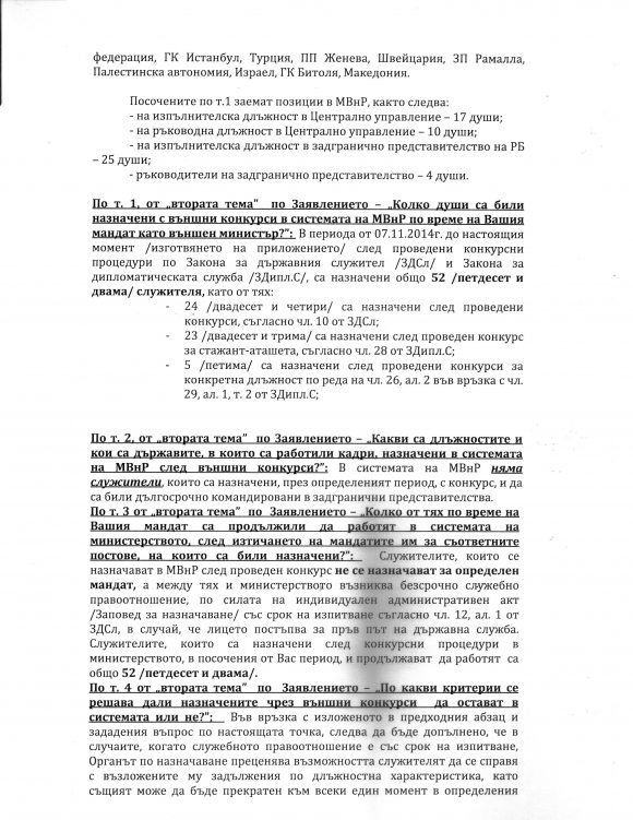 Що се отнася до отговорите, свързани с назначения с т.нар. външни конкурси, в тях пише, че по Закона за държавния служител и Закона за дипломатическата служба, по времето на Даниел Митов са били назначени 52 служители. Както и, че служителите, които са назначени в периода на неговия мандат и продължават да работят в системата на МВнР, също са 52.