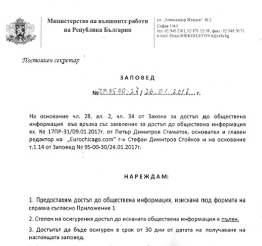 От Министерството на външните работи отговориха на искане по Закона за достъп до обществена информация, изпратено от Петър Стаматов, основател и главен редактор на EuroChicago.com, и Стефан Стойков, граждански активист.