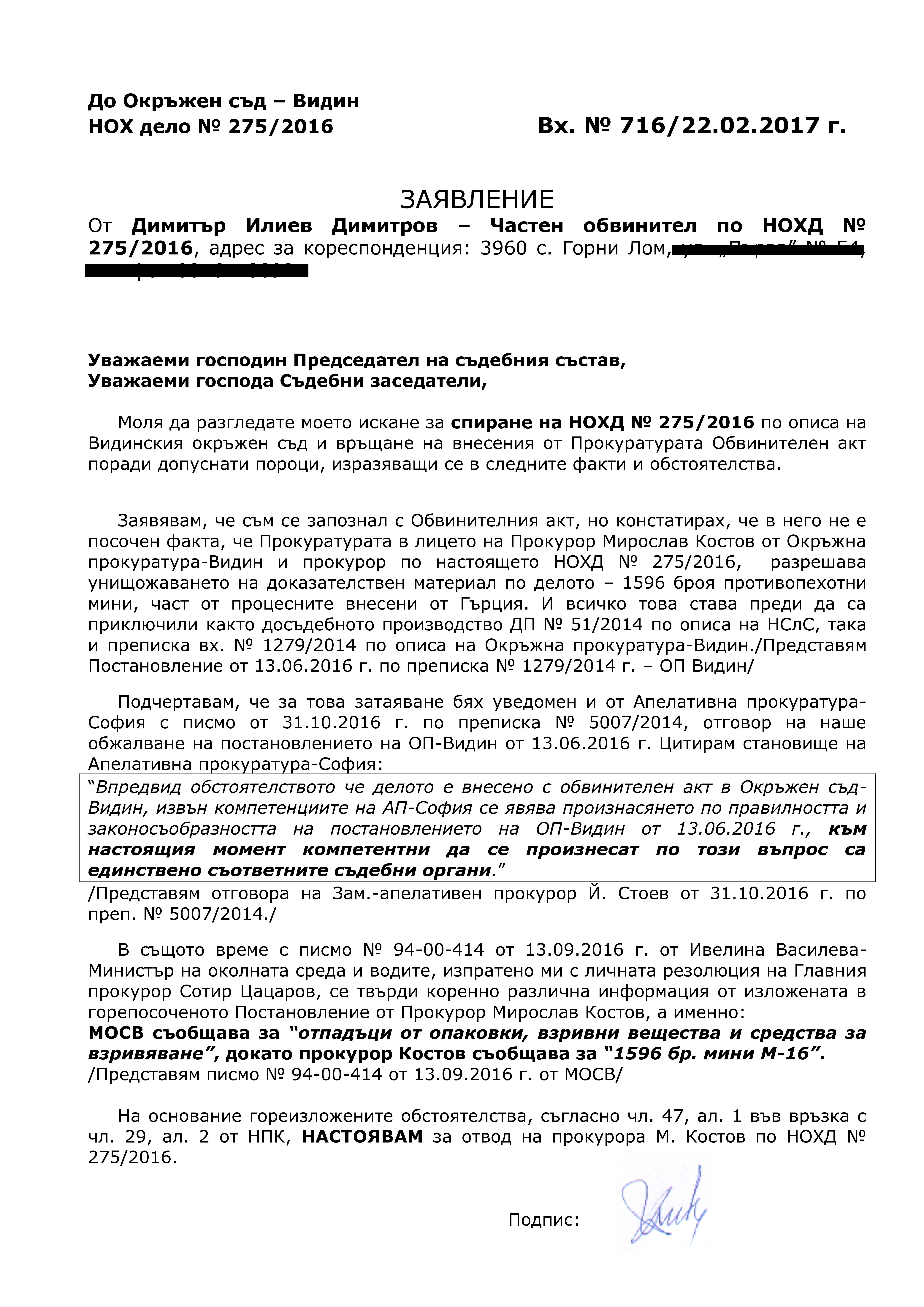 „Заявявам, че съм се запознал с Обвинителния акт, но констатирах, че в него не е посочен факта, че Прокуратурата в лицето на Прокурор Мирослав Костов от Окръжна прокуратура – Видин и прокурор по настоящето НОХД № 275/2016, разрешава унищожаването на доказателствен материал по делото – 1596 броя противопехотни мини, част от процесните внесени от Гърция. И всичко това става преди да са приключили, както досъдебното производство ДП № 51/2014 по описа на НСлС, така и преписка вх. № 1279/2014 по описа на Окръжна прокуратура – Видин. […]